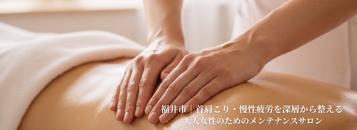 強い刺激ではなく、表層から深い層までオールハンドでゆるめる施術。肩こりや巻き肩、年齢とともに感じる女性特有の身体の変調に対応し、福井市の多くの大人女性に選ばれています。その場だけでなく、日常で感じる“ラク”を大切にしています。